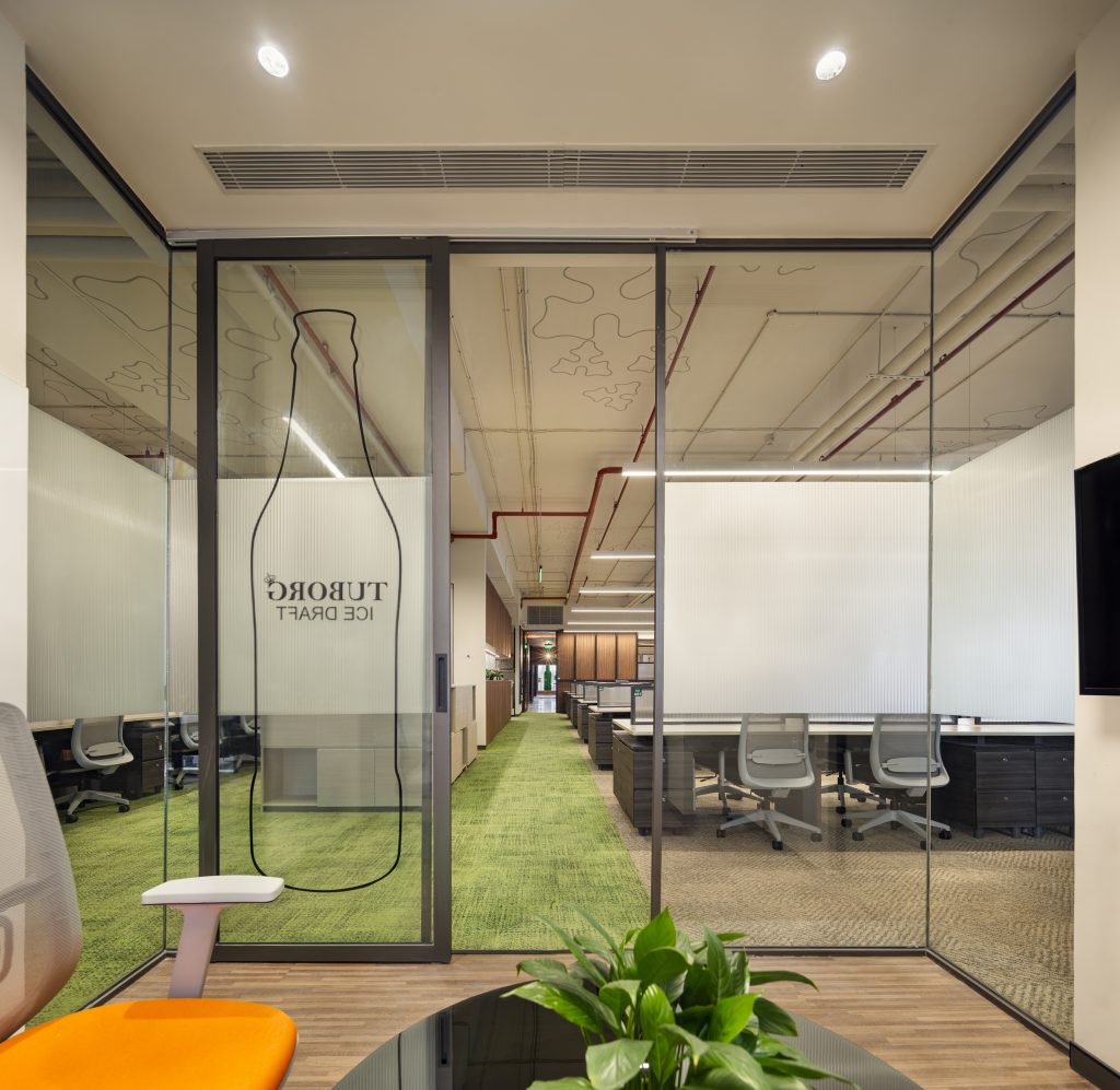 Moving deeper into the domain, the boardroom is planned to accommodate over 30 users at peak occupancy. It has a secondary connection to the reception for quick access for visitors. Custom glass mosaic signage–a masterpiece in essence—reinforces the brand’s legacy. The signage is made from recycled Carlsberg bottles and tempered glass, emphasising sustainability through eco-friendly materials and design practices. Moving on, close to the café is a unique space with floor-to-wall graphics.