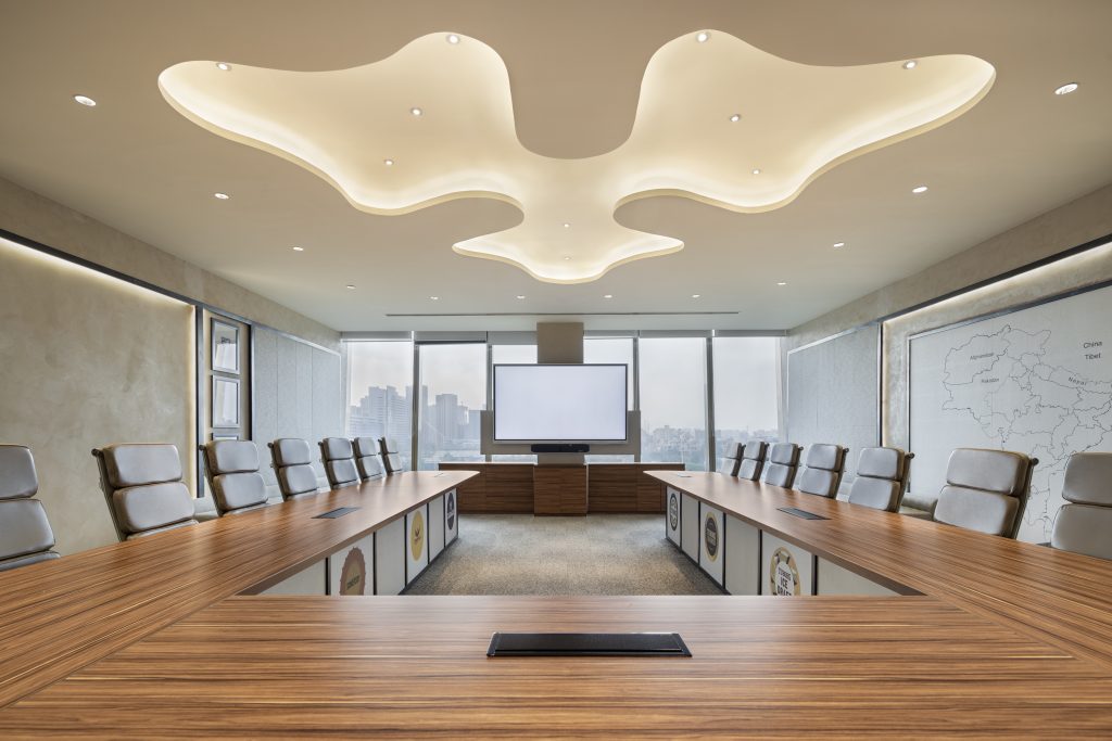 An initial hurdle encountered during the project has been repurposing the reception area into a multifunctional town hall cum activity space. Integrating a foldable, collapsible training room partition that transforms the space without disrupting the functionality of the reception area helps overcome this challenge. Furthermore, camouflaging the AC ducts poses another obstacle, which is addressed through the design of a concealed ceiling. This solution effectively conceals the ducts and integrates the brand logo, creating a cohesive aesthetic.