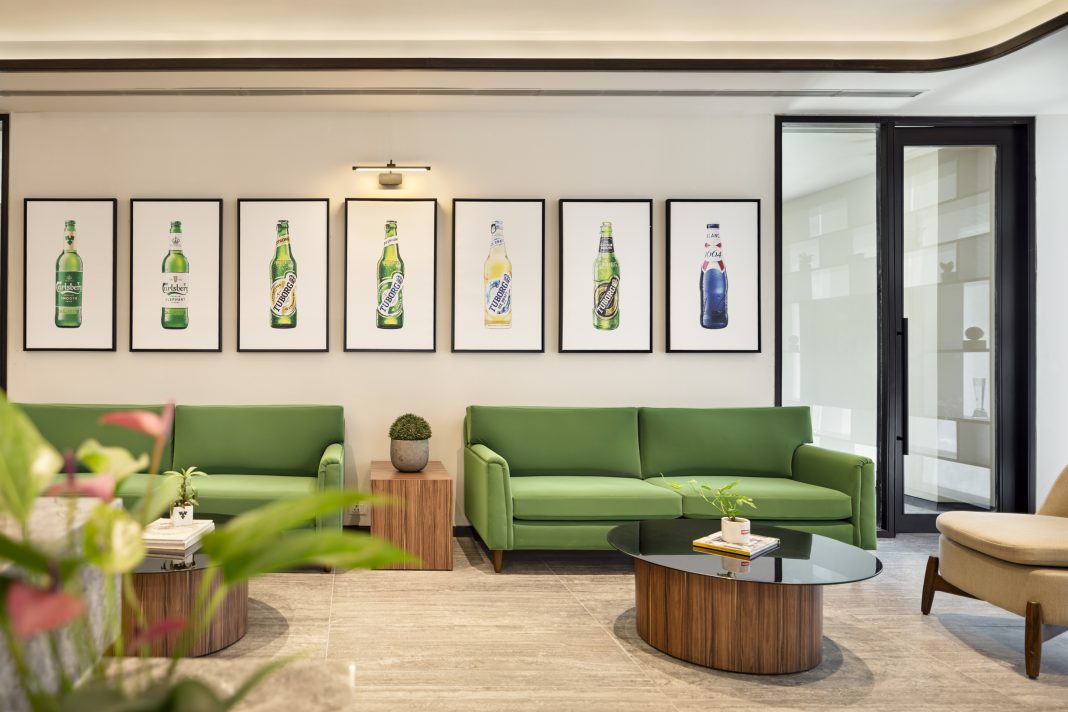 The project brief called for innovative solutions incorporating partitions to concentrate traffic flow into a central aisle. Geometric shapes and see-through glasses have been simultaneously used to divide spaces without building up boundaries and blocking visions. The iconic Carlsberg logo and imagery have been seamlessly woven into the design grammar, creating a layered aesthetic that reflects the company’s evolution. The material palette and colours align with Carlsberg’s brand ethos and commitment to sustainability, with the interior naturally gravitating towards green hues.