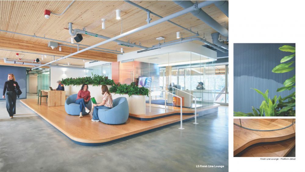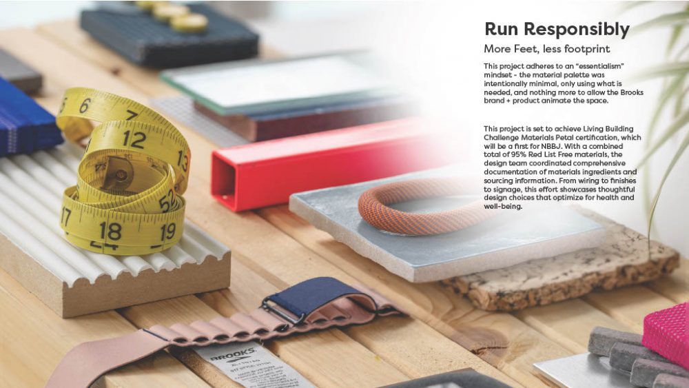 The NBBJ Team, Ryan Mullenix, Miles Stemper, Jasmine Mitchell, Emily Yensland, Ben Spicer, & Alicia Jenkins, designed a sustainable workplace—like the brand—bringing transparency to the design process and embodies Brooks’ emotive and purpose-driven spirit.