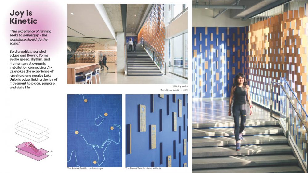 First, Joy is Kinetic—running awakens the senses, lifts the spirit, and connects us to the present moment through rhythm, energy, and movement. The space channels this vitality through shifting reflections, bold graphics, and flowing forms that evoke speed, rhythm, and momentum. A dynamic installation that connects the amenities on the first and second floors evokes the experience of running on nearby lake union, linking the joy of movement to both place and daily life.