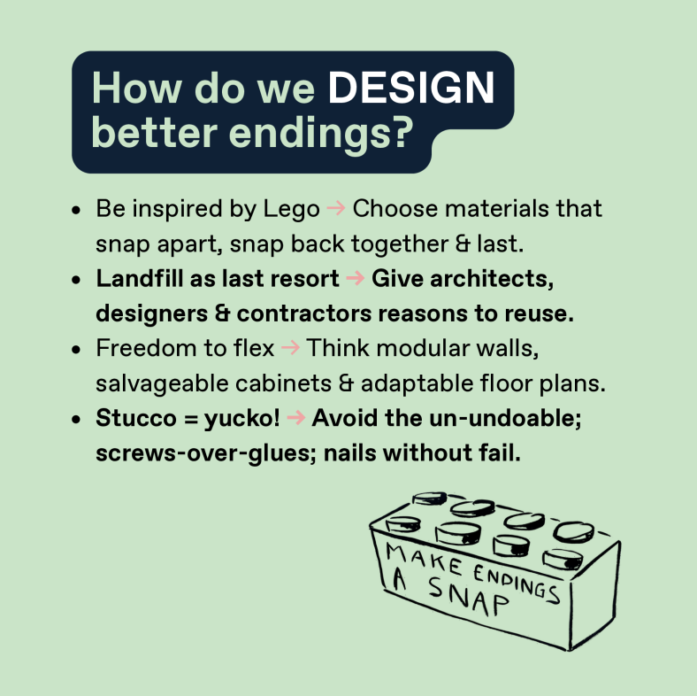 To design better endings, we started with the knowledge that every ending is planned, intentionally or not, in the beginning. Inspired by Lego, we call for materials and systems that “snap apart and back together,” encouraging reversible connections and modular design. “Screws over glues” becomes a mantra — flexible walls, salvageable cabinets, and adaptable layouts that allow buildings to keep learning and changing instead of being demolished.