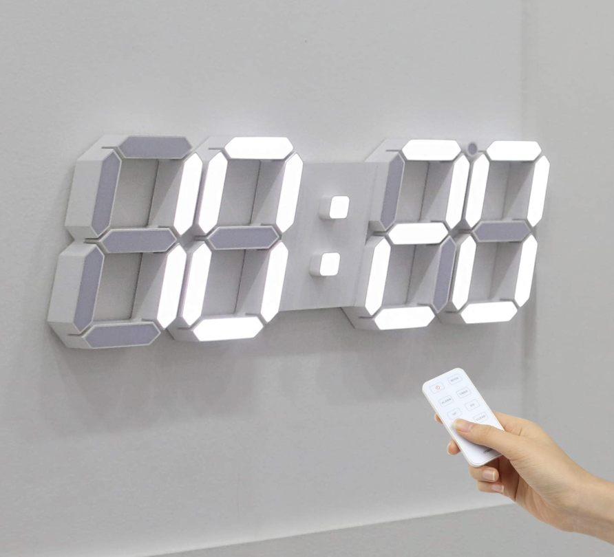 This 3D clock is a bold and modern wall clock that combines digital functionality with sleek design. Measuring about 15.3″ wide, this clock features a large “3D module” LED display that shows time, date, and temperature, and it supports both 12- and 24-hour formats. It includes a remote control for easy adjustments—like setting an alarm, switching display modes, or changing brightness across three levels (high, medium, low). Thanks to a built-in light sensor, the clock can also automatically dim when the room gets dark.