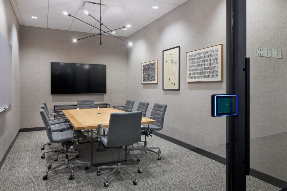 The Root project exemplifies this, deriving its interior palette from the building and location. The structure, a mix of traditional timber and exposed blackened steel with sleek concrete, informed a modern yet warm material palette. The suite’s interiors needed to maintain continuity with the building’s overall architectural language while establishing a distinct identity. It played between the neighboring buildings as well, fitting between corporate commercial office buildings and historic brick creative office buildings both in the neighborhood.