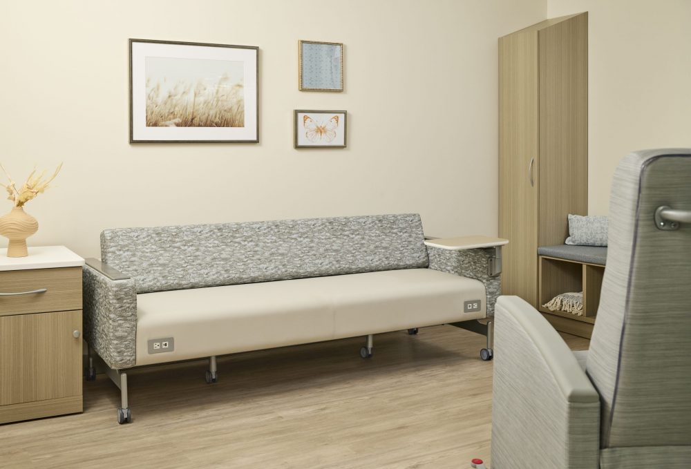 Featuring clean, modern lines and a home-like aesthetic, Embra provides a sense of warmth and comfort. This collection of freestanding lounge, sleep sofas, and modular community seating easily creates spaces for respite, relaxation, and quiet reflection. Embra was created with person-centered design at its core. It is intuitively designed with integrated features including accessible power, storage for personal items, tables, and lighting. These design elements naturally bring humanity into wellness spaces.
