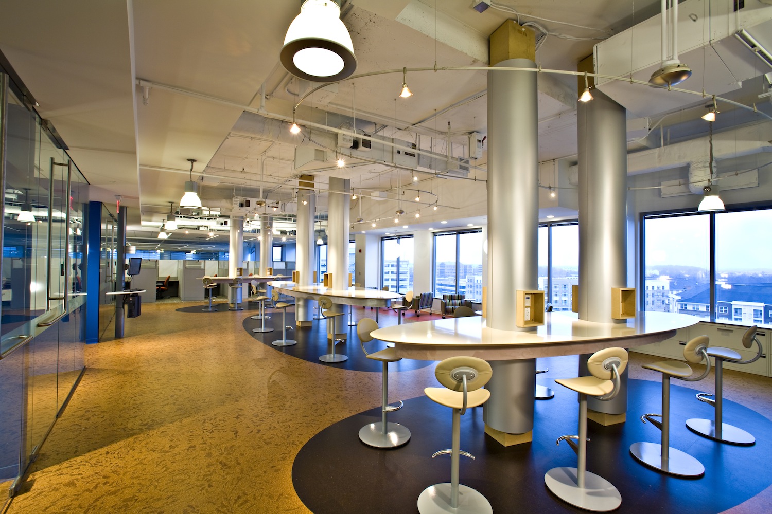 To meet IBM’s need for proposal generation for its government contracting group, the team designed suites on each floor which allow for privacy and sufficient table space for teams to meet to discuss and respond to large-scale proposals. Included on the first two floors are classrooms for new hires, training rooms, conferencing, and a data center. Fourth, fifth, and sixth floors are open office environments with temporary filing and storage systems adjacent to mobility areas for more casual, interactive cafe-style seating with wireless connectivity and immediate access to resources.