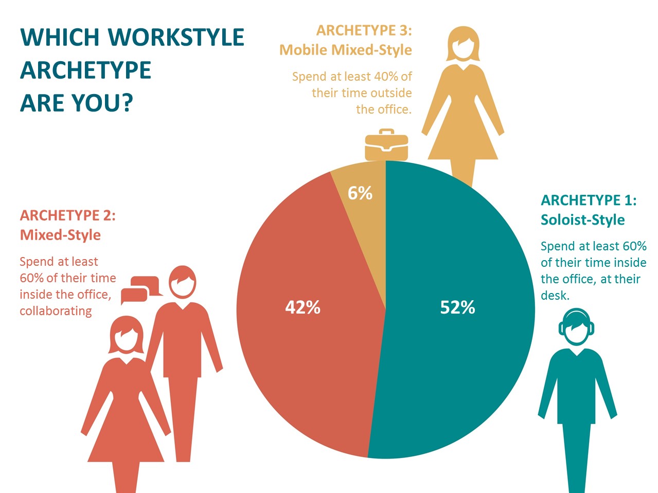 - The Mixed-Style, conversely, was a second archetype who also spent at least 60 percent of their time in the office, but was away from their desk for much of the day, far more collaborative, and constantly interacting with people and teams. This group didn’t require all of the components of a full workstation like the Soloist, but instead needed a home-base to pop into and out of during the day to complete quick task-based assignments between meetings. Additionally, their workstation might need space for a visitor to sit and have a conversation as opposed to the dual monitor setup deemed necessary by the Soloist.