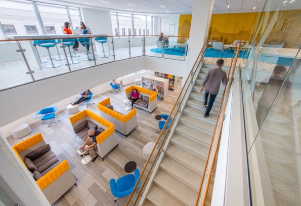 Our second image also uses design techniques to provide a great work environment. First, the variety of spaces provide occupants a sense of control by having a choice of places to work. This layout with nooks off the main area plus a selection of furnishings offers a space for prospect and refuge (aka command position). The man in the yellow chair has a good view of people coming and going, yet the high back provides a sense of enclosure in the open space. Subconsciously we look for a position that offers the most sense of comfort and safety. For example, science shows that in a meeting the leader will most likely take the place with a view of the door – which gives a sense of control by being able to see who may be approaching or entering the space. According to both disciplines, our brains are wired, at the most fundamental level, to maintain a sense of control and security, which these design elements provide.