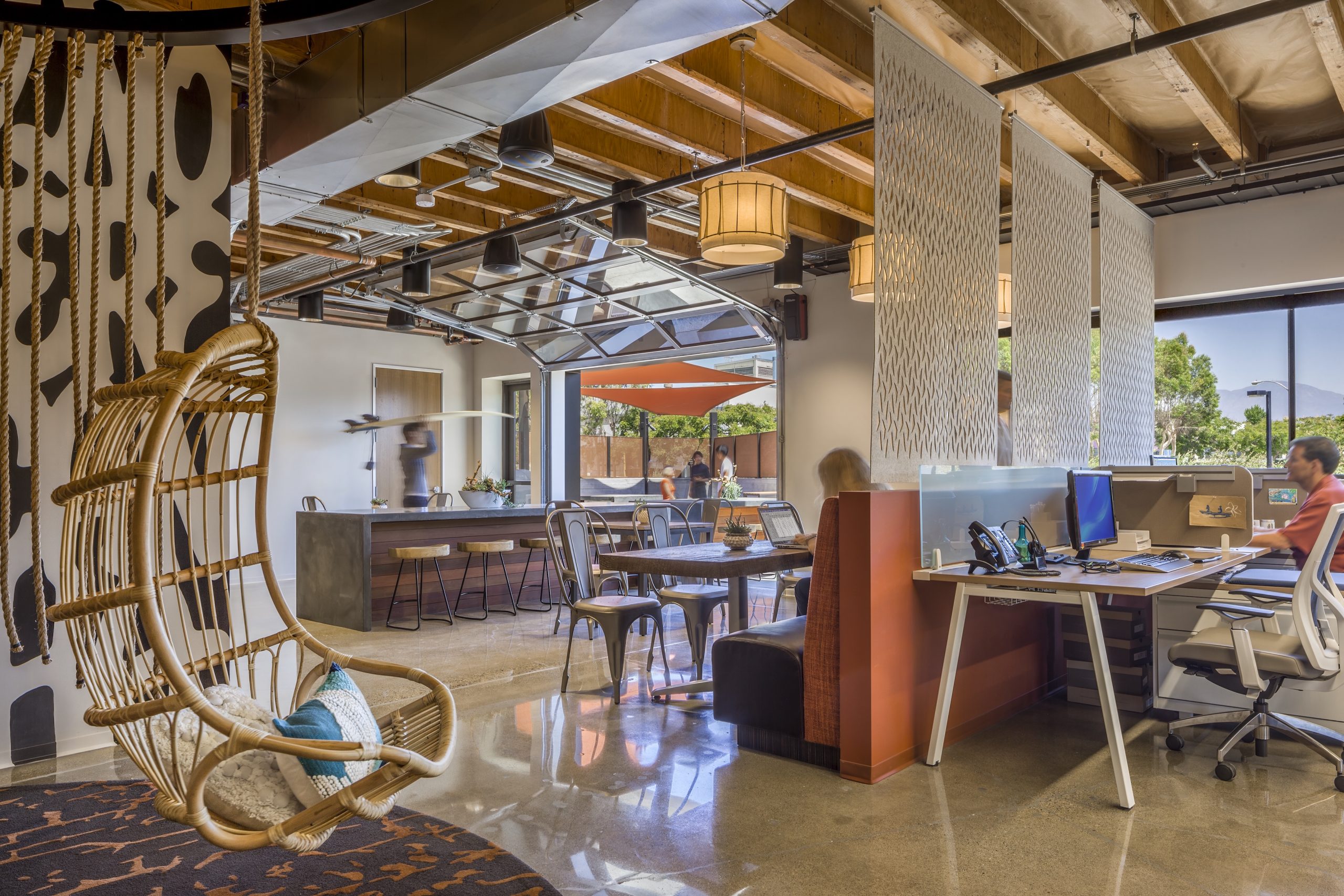 - Coordinating the interior with the exterior. This workspace is immediately adjacent to an outdoor patio. This is a novelty in the office environment, but in this case, the Southern California location provides the opportunity to expose occupants to and create a connection to natural light and views to the land and weather patterns.