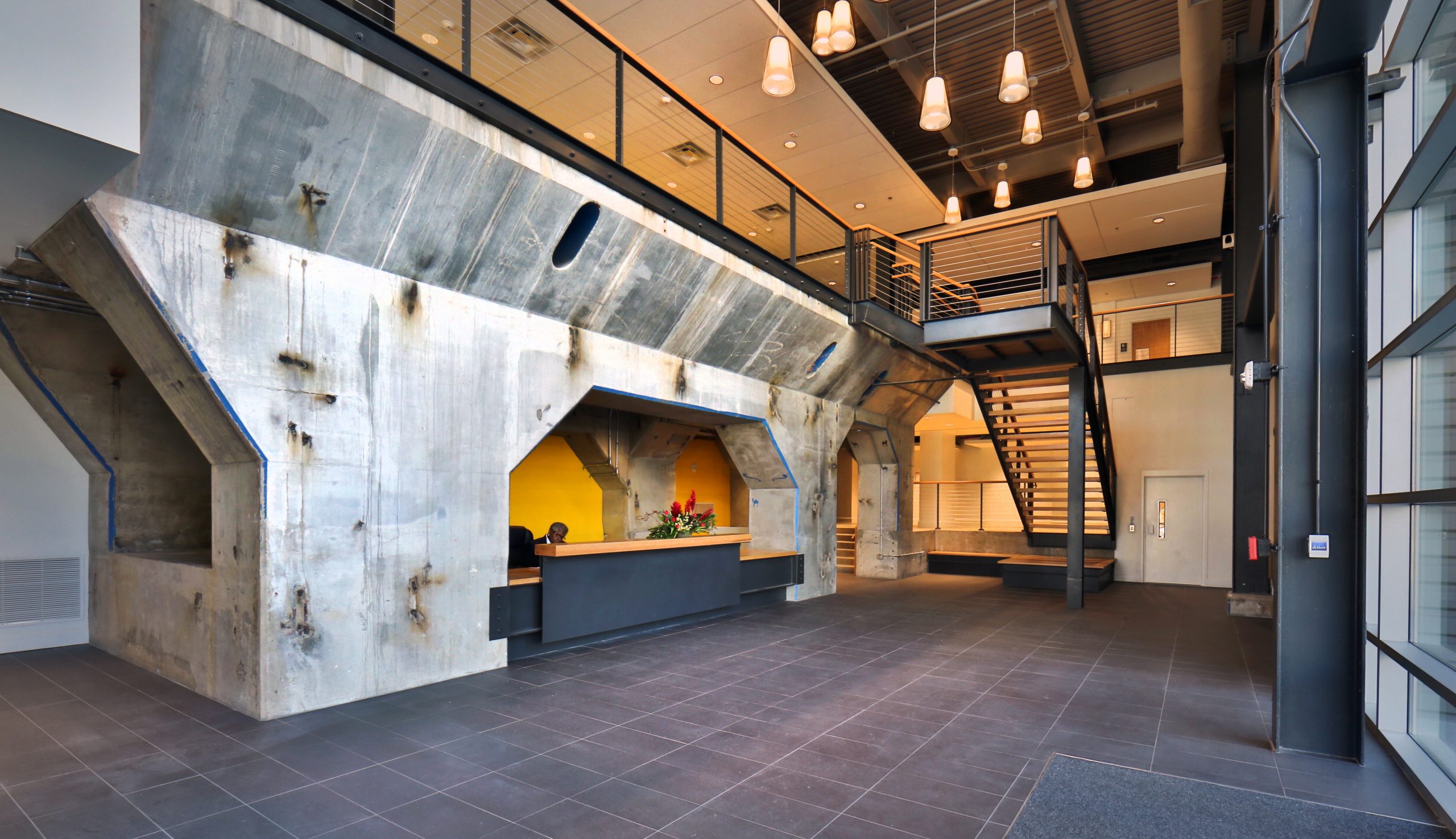 A reception desk nestles into one of the massive concrete structures that once supported turbines in the new Main Lobby.