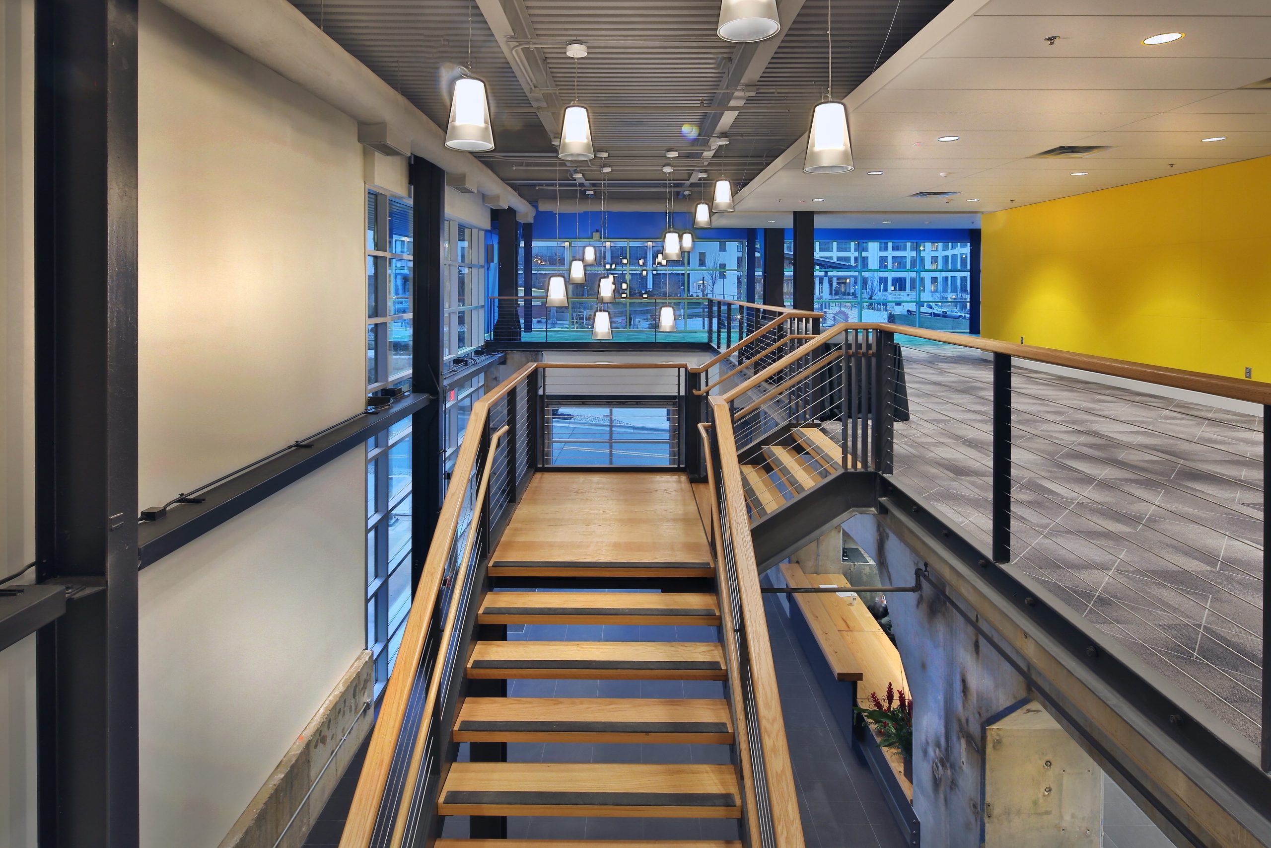 From the second floor of the lobby, building visitors can see out to the adjacent park. Blue and yellow accents reference the original industrial use and color scheme.