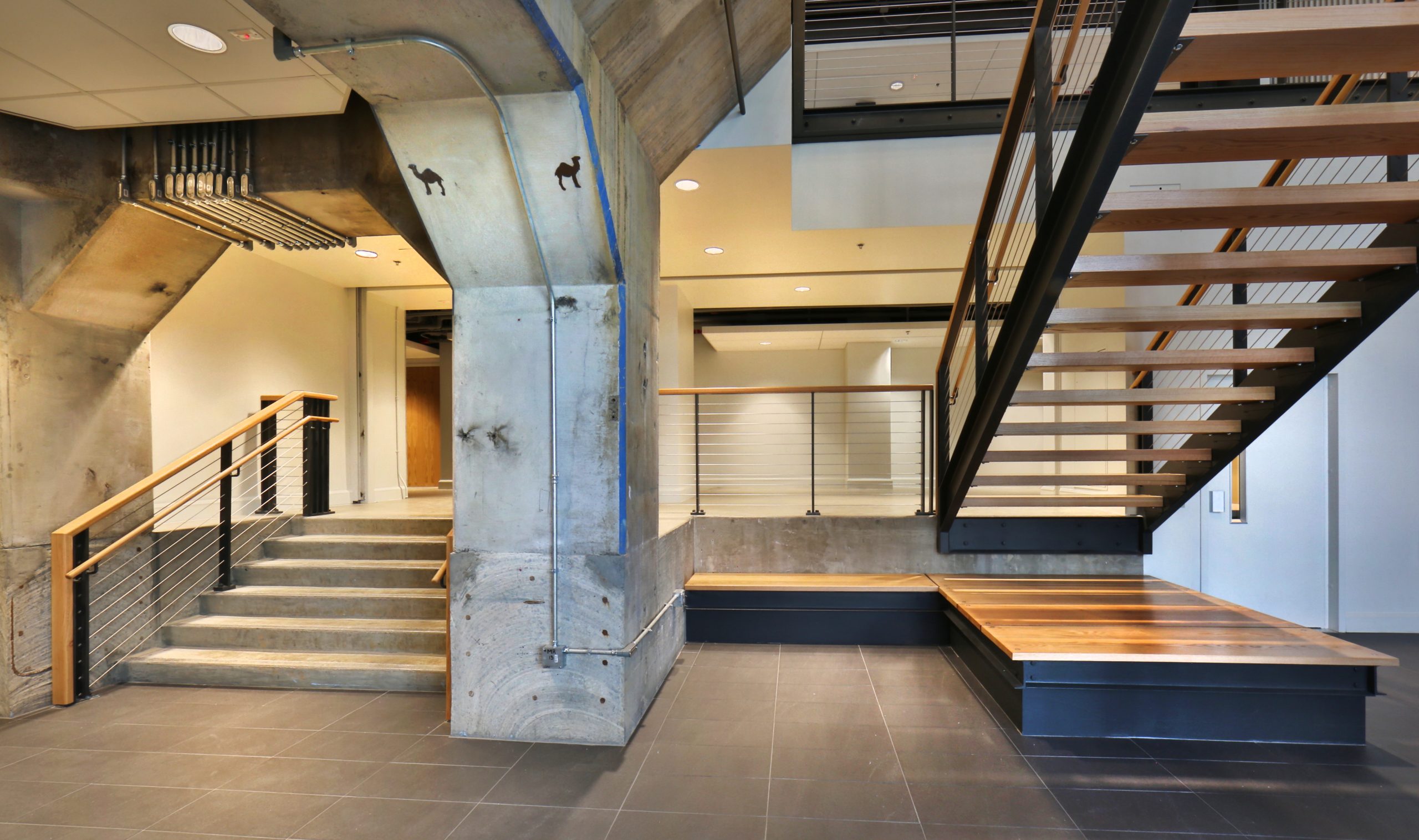 Original details, such as the camel stencils and blue stripes accent the lobby. A new stair harkens back to the original industrial stair in the two-story space.
