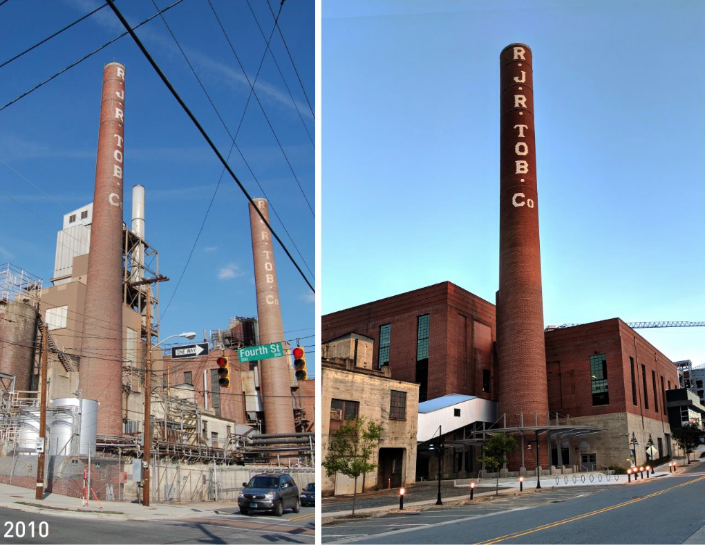 Initially constructed in 1947 as a coal-fired power plant for the R.J. Reynolds Tobacco Company, the Bailey Power Plant is reincarnated as a mixed-use workplace and entertainment hub in Wake Forest Innovation Quarter in Downtown Winston-Salem. The core and shell design honor the building’s historical industrial past by retaining original elements such as distressed concrete structures and blue stenciled camels; while simultaneously looking to the future with a contemporary glass and metal façade, and a north-facing rooftop addition. Slated to receive LEED Silver certification, the Power Plant comes full circle from a coal-fired plant to a restored, resource-saving icon of sustainability.