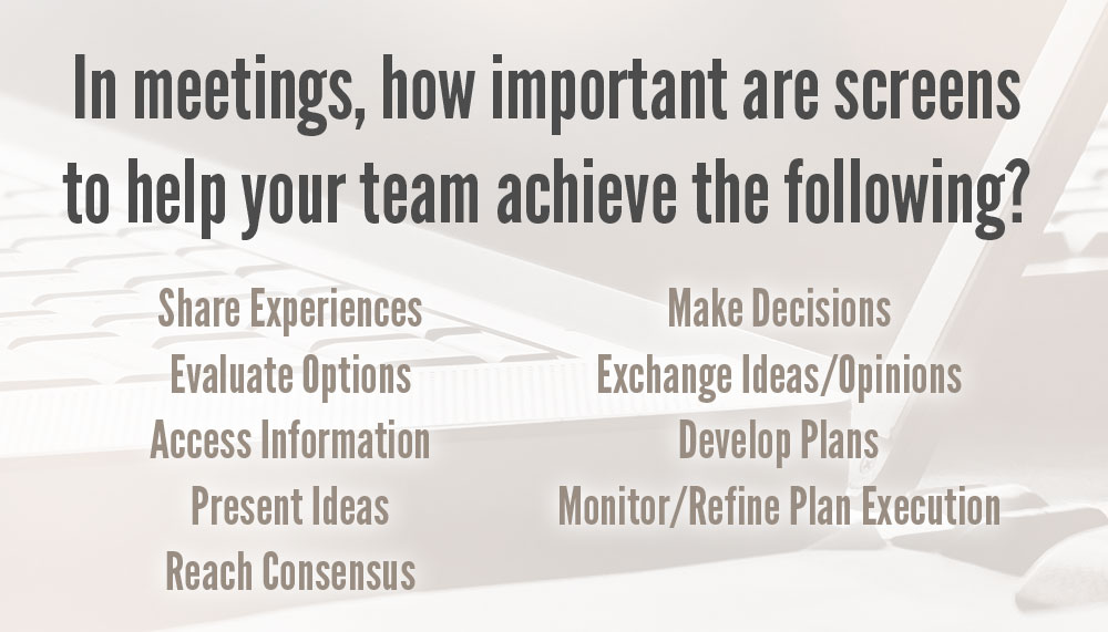 Next, we will discuss how the second question, In meetings, how important are screens to help your team achieve the follow?, can help us determine what people actually do at work.