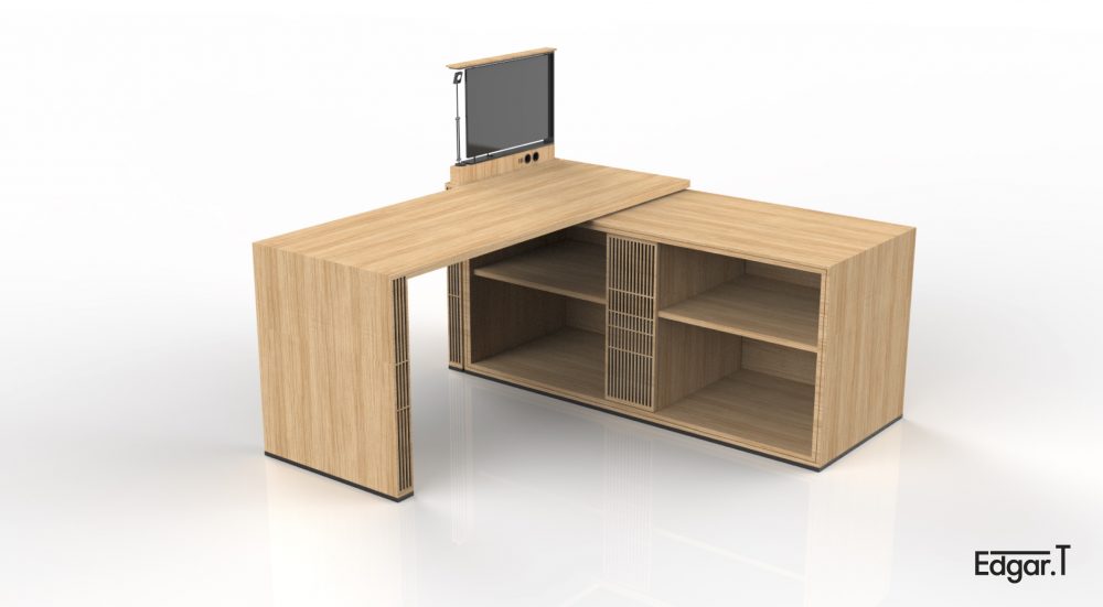 The furniture concept Edgar. T was designed to offer a comfortable work set up within space constraint living environments. The working comfort on one hand is provided by a number of integrated office features such as a desk lamp, a computer screen, a docking station with USB/HDMI ports and electrical sockets for additional devices. The actual desk area consists of an L-shaped arrangement of two large working surfaces, with the additional option to switch to a height adjustable standing desk when required. Edgar. T is equipped with a cabinet with drawers for ample storage of office utensils, as wells as the WIFI mouse, WIFI keyboard and a laptop, when not in use. In addition, shelves within the furniture offer storage space for files, binders, books or simply notes.