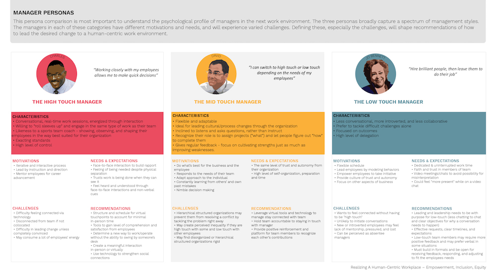 Realizing a human centric workplace was the strongest submission from the ones that I read because it provided a clear process map. It provided an emotional process map going through the five stages of grief and in a normal process and then through intervention, how you could minimize those stages of grief. It also provided “A Day in the Life” map with for personas. I found that extremely insightful and helpful in terms of getting my mind around what was going on and putting myself in the shoes of people that we’re going through this, not only the change management people or the employees, but the managers. I really liked the persona assessment.