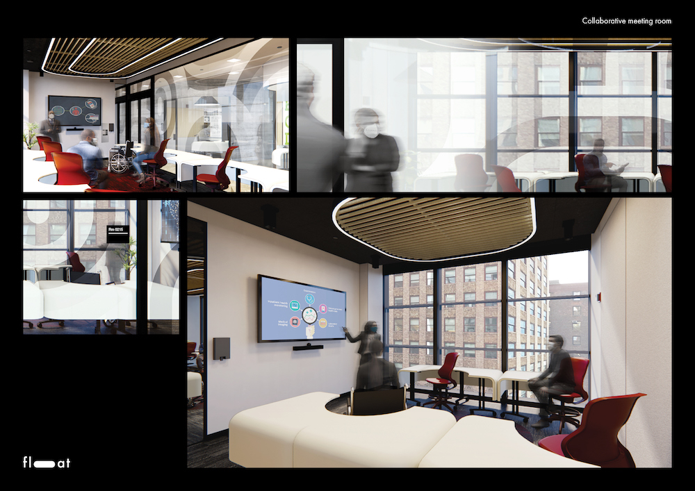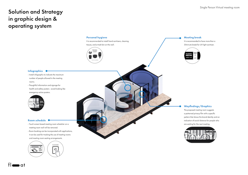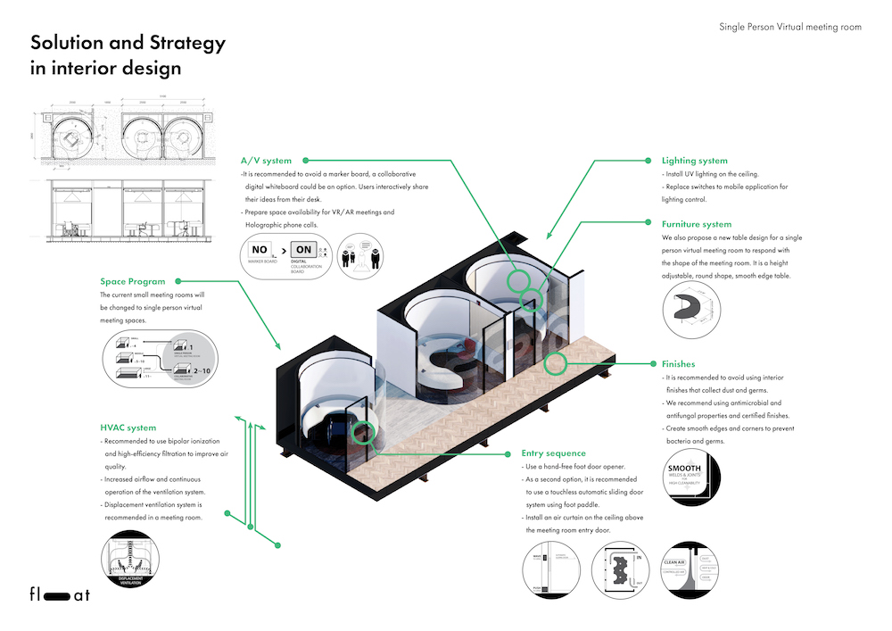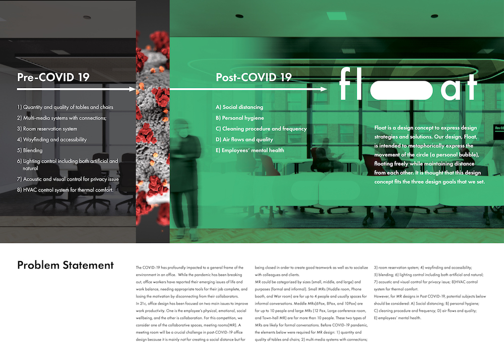 The COVID-19 has profoundly impacted to a general frame of the environment in an office. While the pandemic has been breaking out, office workers have reported their emerging issues of life and work balance, needing appropriate tools for their job complete, and losing the motivation by disconnecting from their collaborators. In 21c, office design has been focused on two main issues to improve work productivity. One is the employee’s physical, emotional, social wellbeing, and the other is collaboration. For this competition, we consider one of the collaborative spaces, MR. A meeting room will be a crucial challenge in post-COVID-19 office design because it is mainly not for creating a social distance but for being closed in order to create good teamwork as well as to socialize with colleagues and clients. MR could be categorized by sizes (small, middle, and large) and purposes (formal and informal). Small MRs (Huddle room, Phone booth, and War room) are for up to 4 people and usually spaces for informal conversations. Middle MRs (6Pax, 8Pax, and 10Pax) are for up to 10 people and large MRs (12 Pax, Large conference room, and Town-hall MR) are for more than 10 people. These two types of MRs are likely for formal conversations. Before COVID-19 pandemic, the elements below were required for MR design: 1) quantity and quality of tables and chairs; 2) multi-media systems with connections; 3) room reservation system; 4) wayfinding and accessibility; 5) branding; 6) lighting control including both artificial and natural; 7) acoustic and visual control for privacy issue; 8)HVAC control system for thermal comfort. However, for MR designs in Post COVID-19, potential subjects below should be considered: A) Social distancing; B) personal hygiene; C) cleaning procedure and frequency; D) air flows and quality; E) employees’ mental health.
