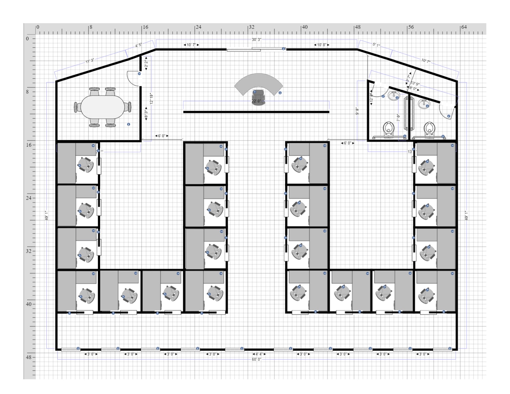 Common areas such as bathrooms, reception areas, and conference rooms are spaces where germs spread easily. We decided to make single bathrooms with motion-sensor faucets and hand sanitizer dispensers by the door. The reception area will include limited seats that will be spaced out. The conference room will be limited to 10 workers at a time. Employees can use an intercom system from their cubicle to join meetings if needed. Each cubicle has a built in intercom system so they can communicate with each other while remaining socially distance. Writing ideas to solutions is also very important. Ben Franklin kept a notebook with him, so he could write down ideas when he had them. To help the employees utilize that notion, one wall of the cubicle will be dry-erasable to write down their notes.