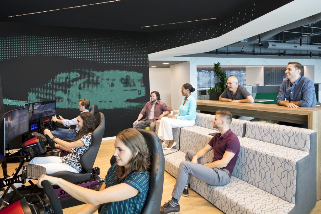 It is understandable that some organizations may be hesitant to invest in, well, playfulness in the workplace. However, play, in any form, has been shown to boost creativity in adults. SmithGroup clients have incorporated a range of immersive and playful activities into their spaces as innovative means to enhance collaboration, relationship building and more. These elements have included virtual golf simulators, an interactive NASCAR experience, gaming rooms, slides, indoor bicycles, music rooms, meditation rooms and more.