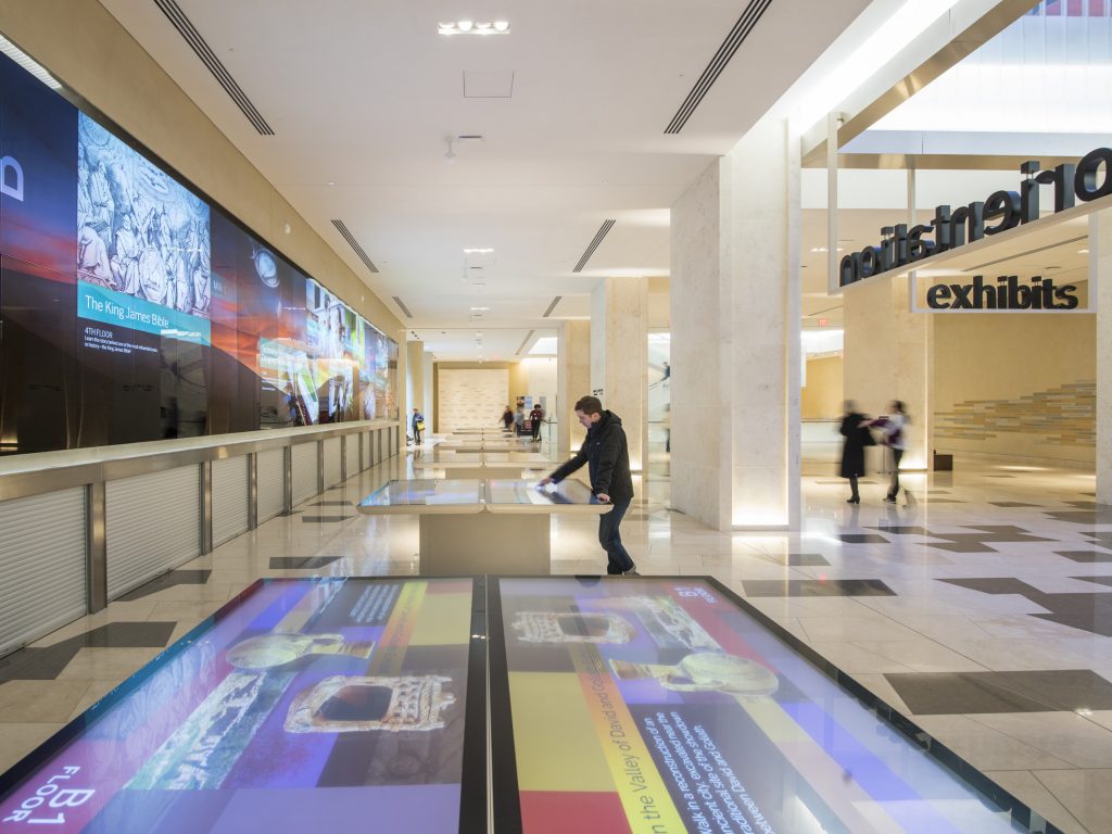 Creating immersive experiences that foster purpose centers on weaving together stories and experiences, facilitating participation and inclusion, and eliciting meaningful interaction between an individual and the exhibit. Multisensory displays can be incorporated into a workplace in many forms and can be designed to accommodate varying degrees of interactivity, technological integration and cost. Companies desiring a highly technical exhibit may choose to incorporate virtual reality, augmented reality, layers of massive projections or a combination of other high touch components.