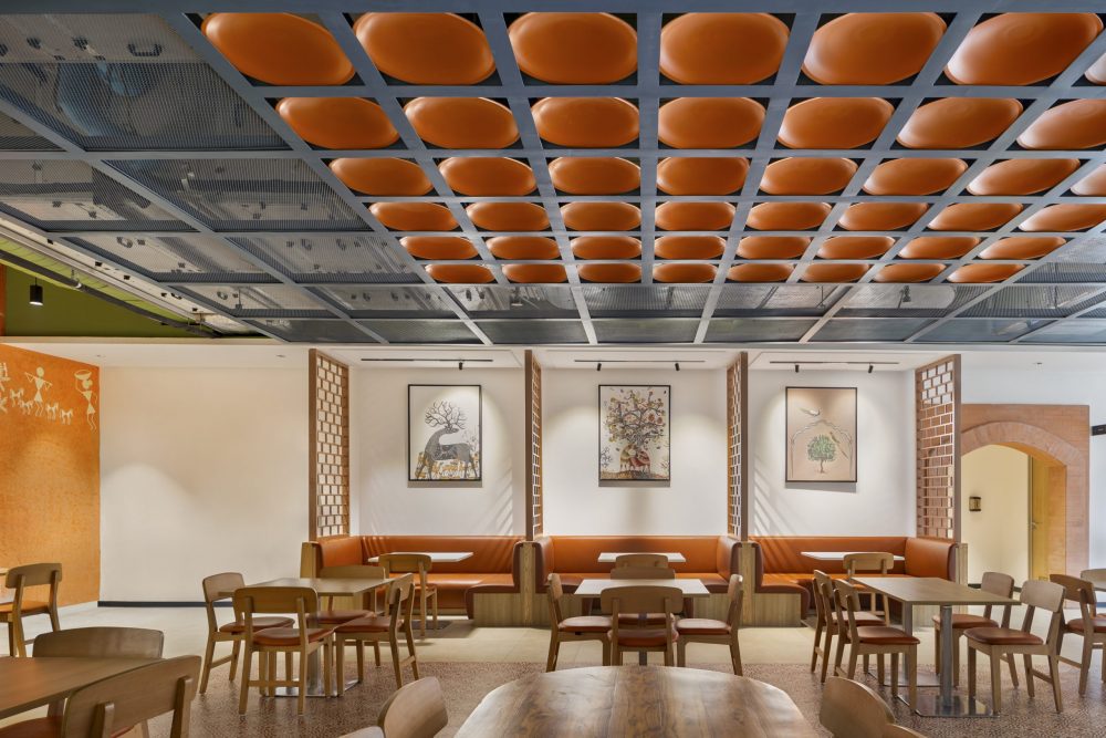In the cafeterias on the ground and eighth floors, the atmosphere shifts to a more vibrant energy befitting communal spaces. On the ground floor, Traditional Gond and Warli murals pulse with folk rhythms along the walls, while overhead, false ceilings integrate traditional earthen taslas (cooking vessels), amplifying the sense of place. Brick-inspired jaali screens craft intimate enclaves within the larger whole. Paintings commissioned from Kalakari Haat punctuate the walls, anchoring this social hub in local artistry. Turfed hills for sitting, dhaba-style cots used as seats, truck art-inspired fascia on counters, and a real auto-rickshaw repurposed as a food counter bring a playful character to the space. These elements, combined with brick and terrazzo finishes across the walls and flooring, create a relaxed, roadside-style cafeteria on the eighth floor.