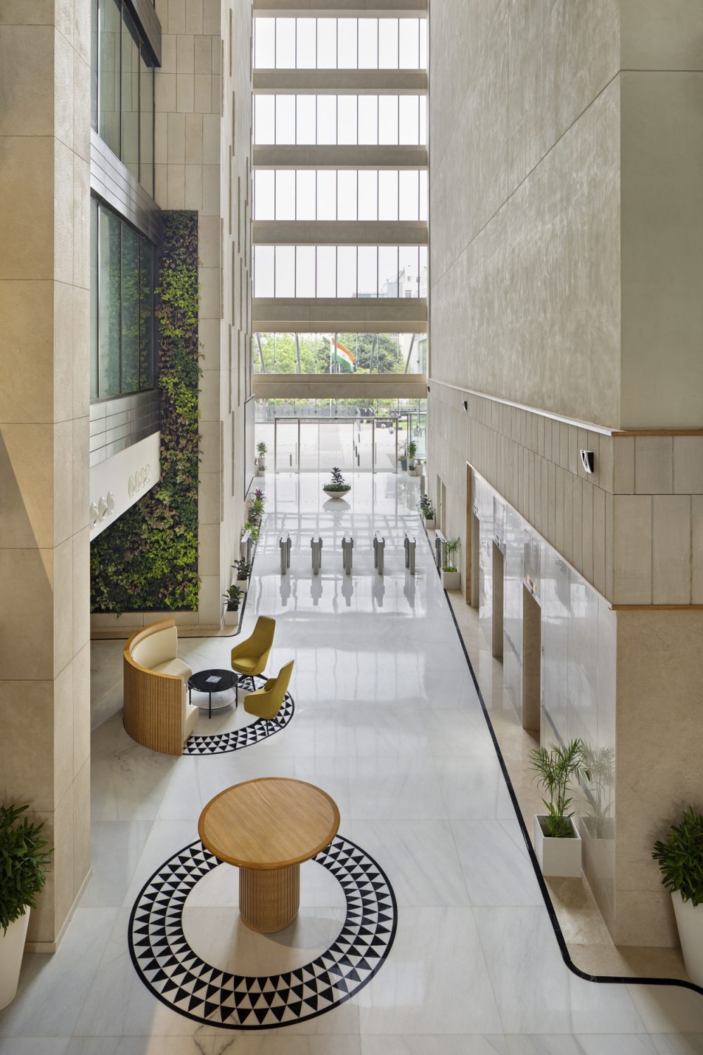 Across materiality, colour palette, layouts, and lighting, visual clutter is eliminated at every step through meticulous detailing to create a timeless museum-like space. A calm palette of white, black, and warm wood tones is used consistently, with subtle variations in shade and texture to create a modern aesthetic. Beige Gwalior mint sandstone cladding anchors the ground floor with refined luxury, while zinc-clad walls and black metal frames add measured contrast. Fluted wood panels introduce hints of warmth, rhythm, and texture. Expansive white and beige marble flooring, highlighted with subtle black and grey accents, creates a bright and refined base for the design. The light-toned palette visually enlarges the relatively compact atrium, creating a sense of openness despite its smaller footprint within the overall floor plate.