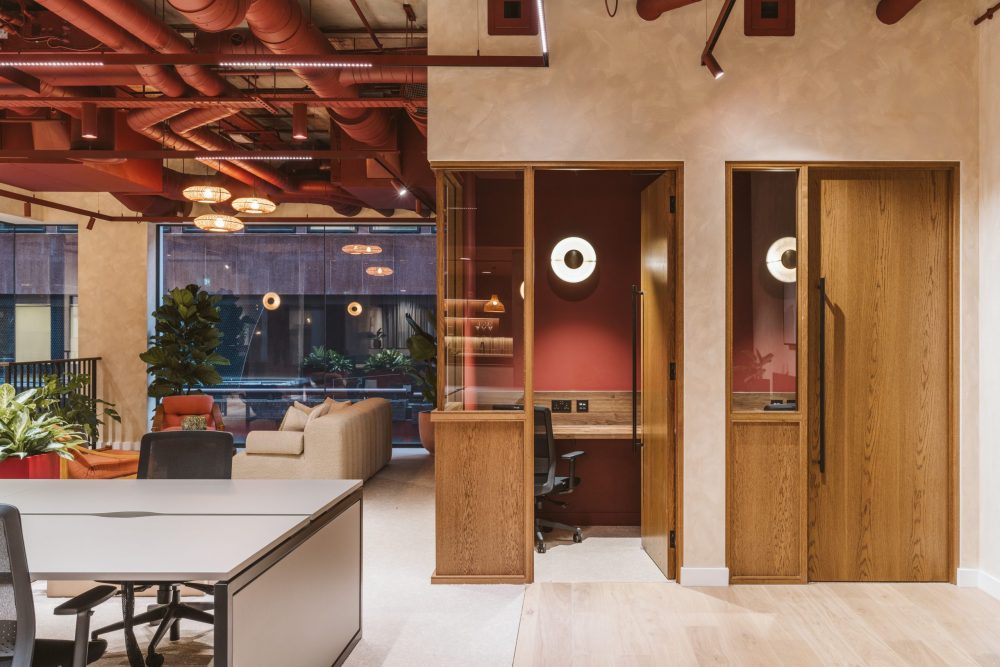 Achieving a ‘best-in-class’ co-working space required invention as well as function, with the use of striking finishes such as tiling and biophilic design. With tones of burgundy and scarlet, alongside luxurious woods seeded throughout, the space is a modern take on commercial fit-outs, stepping away from more conventional design choices, for something more sensory.