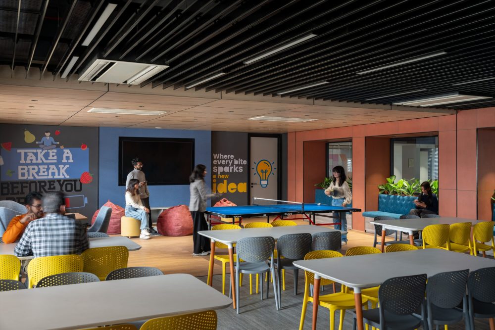 On the West side, a double-skin facade features terracotta-coloured GRC lattices, mixed with vertical greens. This is supported by a grey metallic frame. A part of the facade has a curtain wall that lets natural light into the office areas. On the South side, deep projections frame large louvered windows. These let sunlight in while cutting down glare.