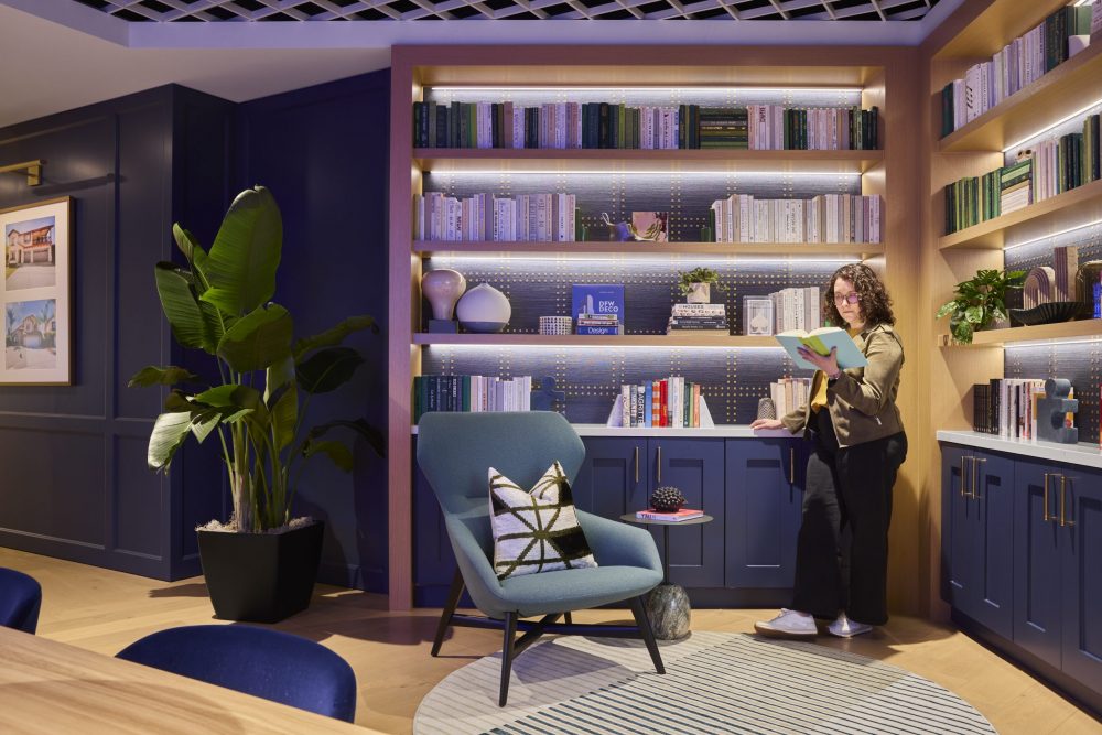 Especially for companies moving away from assigned seating to free address seating, styling can be a way to add personality to an office. In these spaces, desks lack the personal touches that employees bring to assigned desks. Instead, layers of curated books, tchotchkes, and other accessories enliven communal areas. By styling the lounge at the Brunswick Group’s Dallas office, designers were able to add life and personality to the space. Styling created a lived-in look that contributes to the overall character and storytelling of the space, making it a place where employees want to spend time.