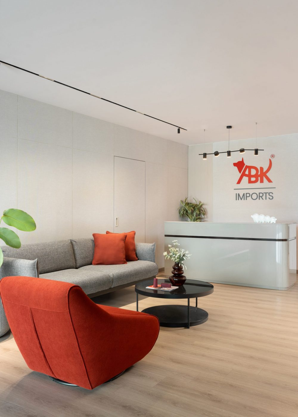 The resulting design, a pet-friendly, people-centric office, embodies ABK’s identity with thoughtful planning, humane materiality, and strategic color play. The signature bright red brand hue runs as a visual thread through the office, from subtle lighting accents to furniture details, connecting the space to the company’s logo and spirit.