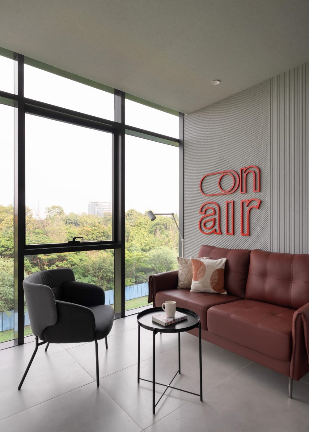 From the directors’ tailored cabins with sit-stand desks and reading corners, to the podcast room marked with “On Air” signage, every space was designed with intentionality. Even the training room and open pantry were detailed to promote collaboration and comfort, using red-accented lighting and easy-to-clean surfaces.