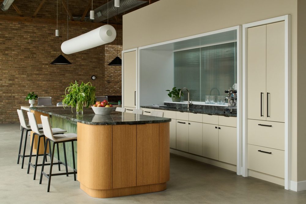 Spatial definition without enclosure became another major consideration. To preserve openness while creating intimacy, En Masse introduced kitchen millwork volumes that subtly divide the floor plate into zones. These “rooms within a room” foster smaller group interactions while maintaining a visual and social connection across the space.
