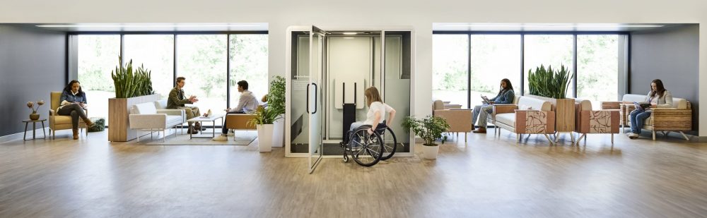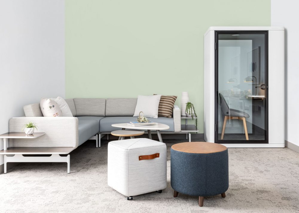 Designed to offer accessibility to peace and quiet in an open environment, Kolo Pods provide private respite areas within workplace settings. Its anti-eavesdrop design reduces speech intelligibility and dampens sound, creating a space for confidential conversations or quiet respite. Not only does the pod keep noise in, it keeps environmental sounds out, providing a space free of distractions. For additional visual privacy, partial frost and full frost privacy decals can be applied to the glass walls or doors. By providing a place to destress and find comfort, facilities can help mitigate burnout and boost employee retention.